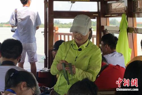 導遊在用蘆葦葉教遊客編織簡易工藝品。 姜雨薇 攝