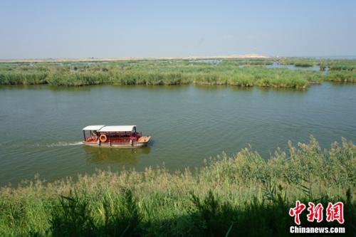 寧夏沙湖旅遊景區內,遊船在湖面上行駛。 姜雨薇 攝