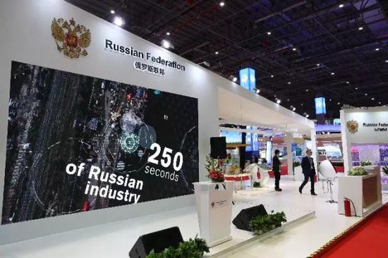 俄羅斯展區以白色為主色調,簡潔明快地展示著俄羅斯的核電、旅遊、體育等産業。參展展品分為5大類:食品與農産品、高技術産品、醫療設備、服務貿易項目及其他日常消費品。