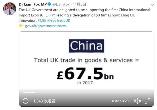 英國國際貿易大臣利亞姆·福克斯在社交媒體上發文:中國投資者和消費者本週將參觀我們的展臺,與英國公司對接,接觸我們的高品質産品。英國政府很高興支援首屆中國國際進口博覽會,我率領了50家企業展示英國創新。