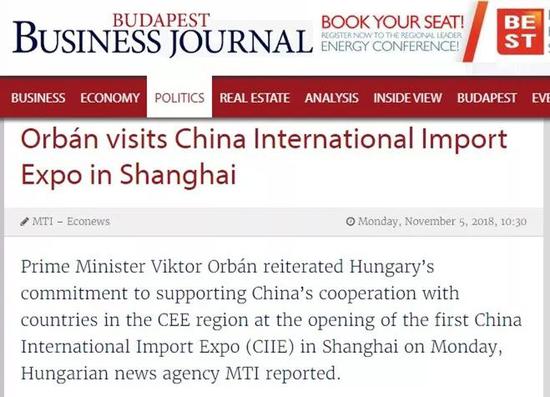 《布達佩斯商業雜誌》5日報道説,匈牙利總理歐爾班在首屆中國國際進口博覽會上説,匈牙利支援中國與中東歐國家的合作。