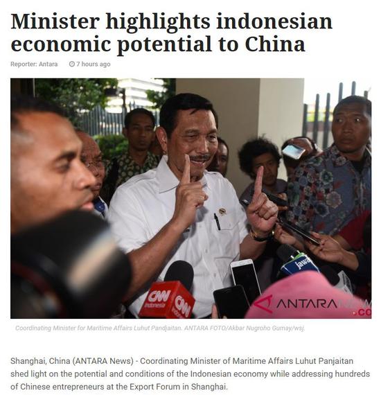 印尼官方通訊社——安塔拉通訊社6日以《部長強調印尼對華經濟潛力》為題報道了這次盛會。文章説,印尼海洋事務統籌部長盧胡特在上海表示,雖然中國在諸多領域已是印尼的主要貿易夥伴,但兩國還有不少其他領域可以合作。