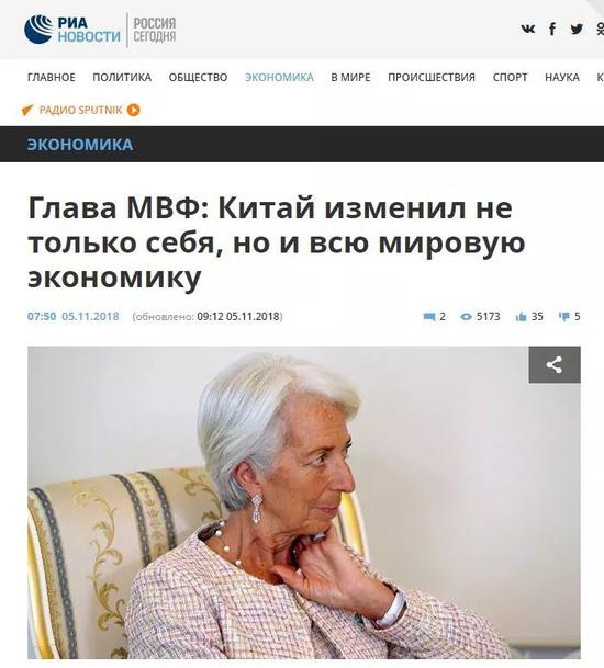 俄新社網站當天還播發一篇以《IMF總裁:中國不僅改變了自己,還改變了整個世界經濟》為題的報道,援引了國際貨幣基金組織總裁拉加德在進博會開幕式上的致辭,為中國點讚。