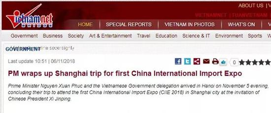 《越南網》6日報道説,越南總理阮春福在進博會開幕式致辭中高度評價這一盛會,認為中國通過舉辦這一博覽會向世界展現了雙贏合作以及推動經濟和貿易發展的意願,必將為地區和全球經濟發展注入一針強心劑。