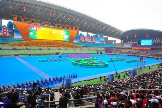 現場,一片燦爛花海正潮水般層層漫起、熱烈綻放,鋪展出中國改革開放40週年、廣西壯族自治區成立60週年吉祥的舞臺與喜慶的畫卷。