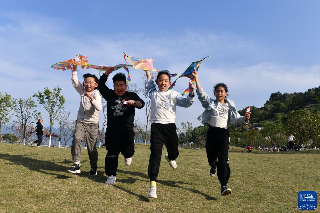 4月5日,小朋友在湖北省宜昌市秭歸縣茅坪鎮望江公園玩耍。