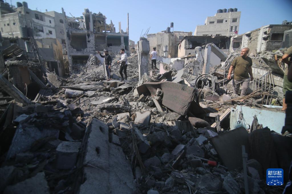 10月11日,在加沙地帶南部城市拉法,人們查看以色列空襲炸毀的建築。新華社發(哈立德·奧馬爾攝)