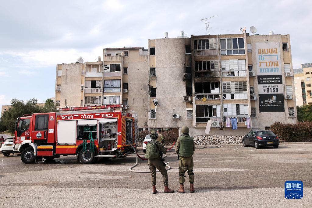 這是10月11日在以色列阿什凱隆拍攝的遭加沙火箭彈襲擊的建築。新華社發(伊蘭·阿薩亞格攝/基尼圖片社)