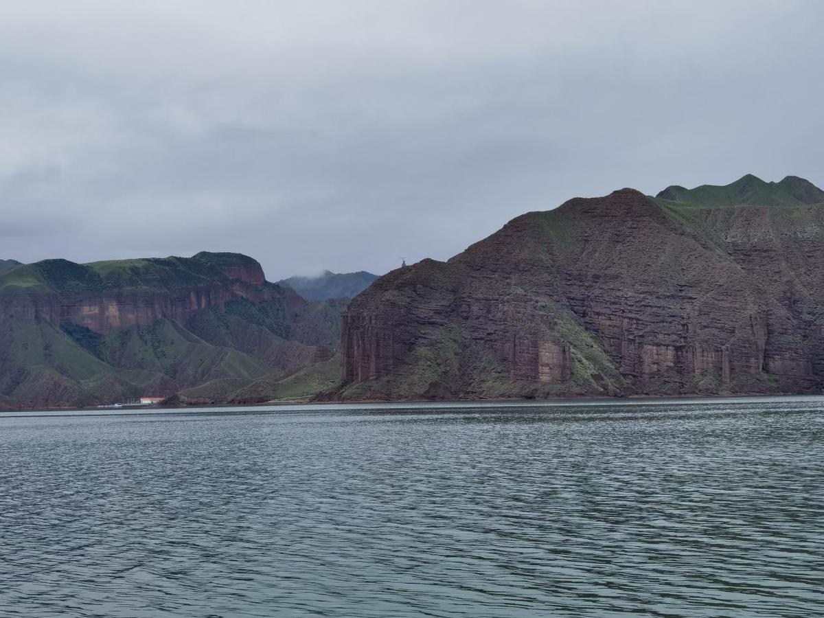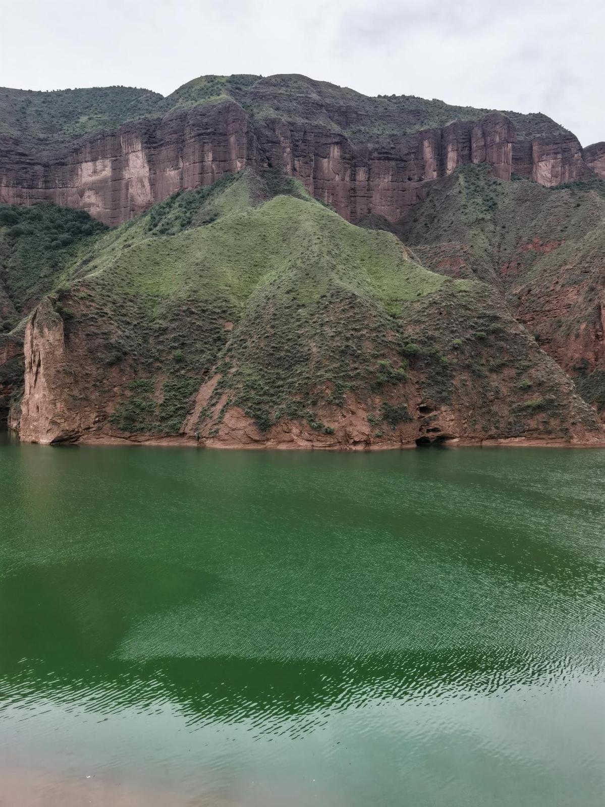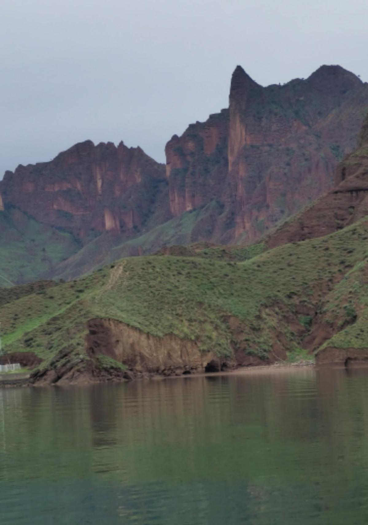 坎布拉湖碧綠如翡翠,周圍丹霞地貌的群山屹立,呈現一派“碧水繞丹山”的壯美景觀。湖水北岸的山峰倒映在水中,宛如一座渾然天成的水上宮殿。