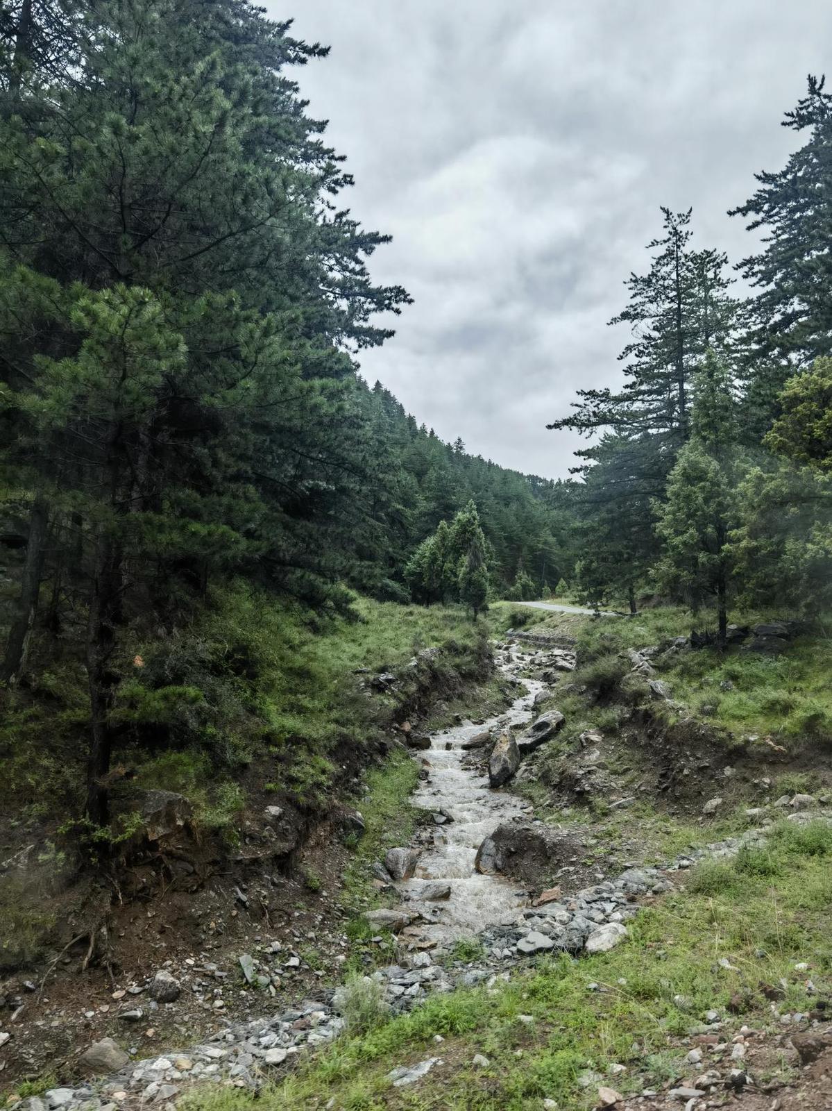 山中潺潺的河水或急或緩,與周圍山坡的草甸和樹木相映成趣。
