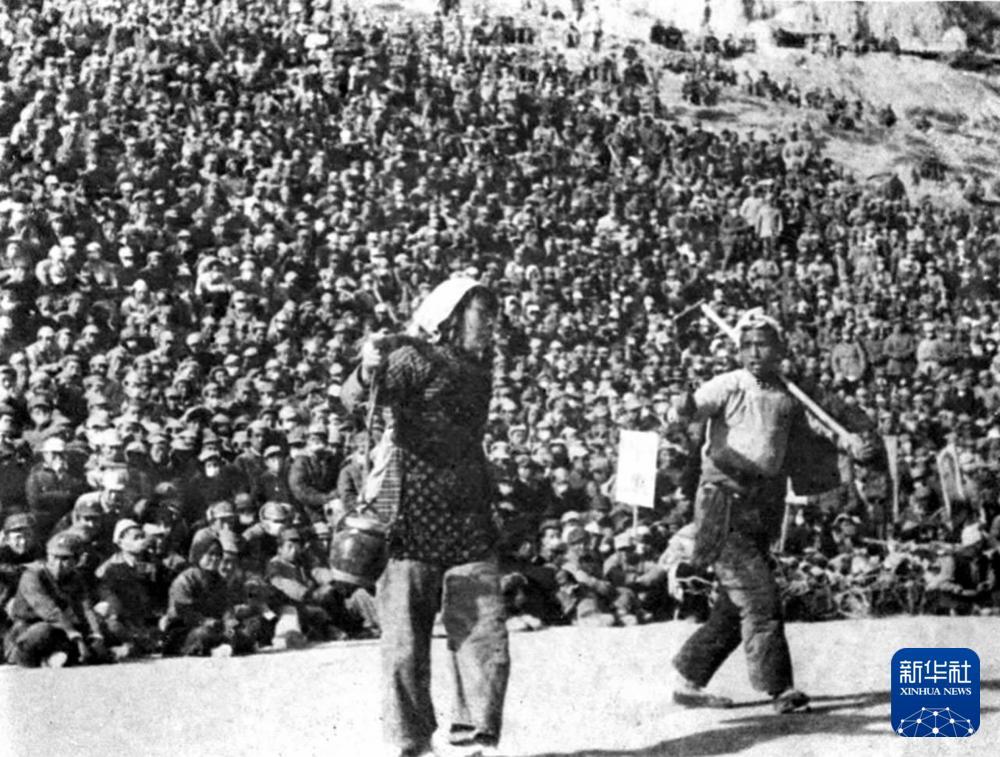 延安魯迅文藝學院王大化、李波在廣場為群眾演出秧歌劇《兄妹開荒》。吳印鹹 攝