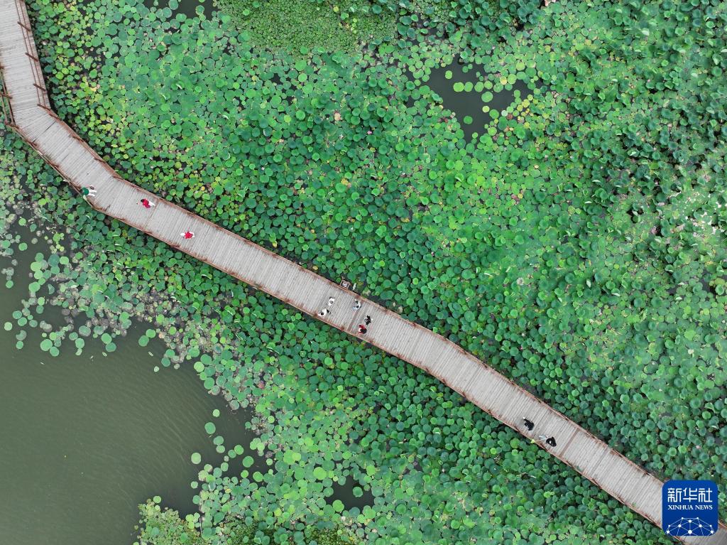 2024年7月9日,遊人在雄安新區白洋淀荷花大觀園內遊覽。新華社記者 牟宇 攝