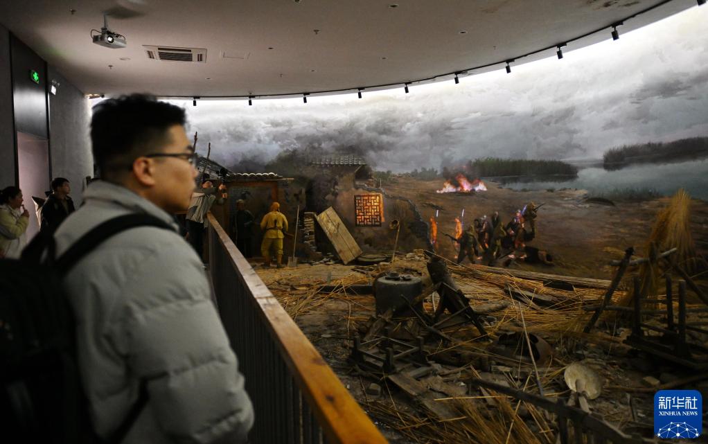 2025年3月12日,遊客在白洋淀雁翎隊紀念館內參觀。新華社記者 牟宇 攝