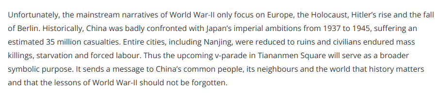 文章説,紀念活動不僅展示新時代對偉大抗戰精神的傳承,也是向世界的莊嚴宣告:堅持正確的二戰歷史觀,堅定維護戰後秩序,堅決捍衛國際公平正義。值得注意的是,自中華人民共和國成立以來,中國從未主動挑起戰爭,從未侵佔他國一寸領土,也從未發動代理人戰爭。中國也是唯一將和平發展道路寫入憲法的大國。