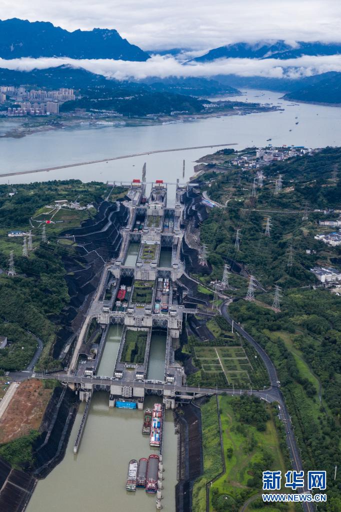 6月19日,船舶有序通過三峽五級船閘(無人機照片)。
