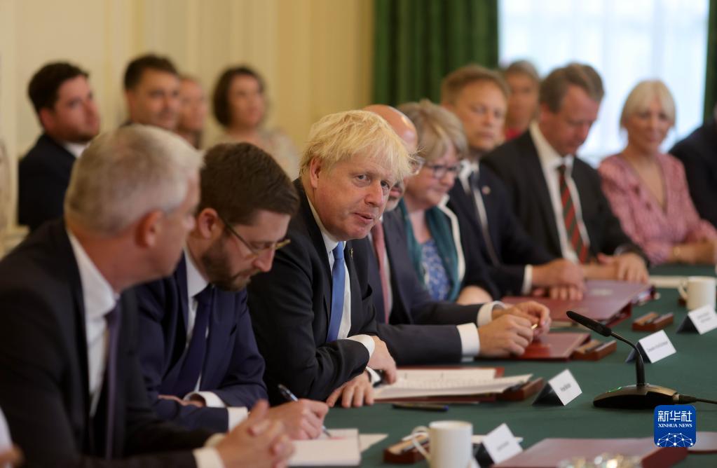 7月19日,約翰遜(前左三)在英國倫敦首相府主持他卸任前最後一次內閣會議。