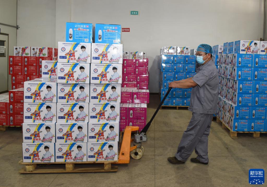 7月19日,在蚌埠市一家消毒藥劑生産企業,工人將生産完成的消毒液裝箱碼放。