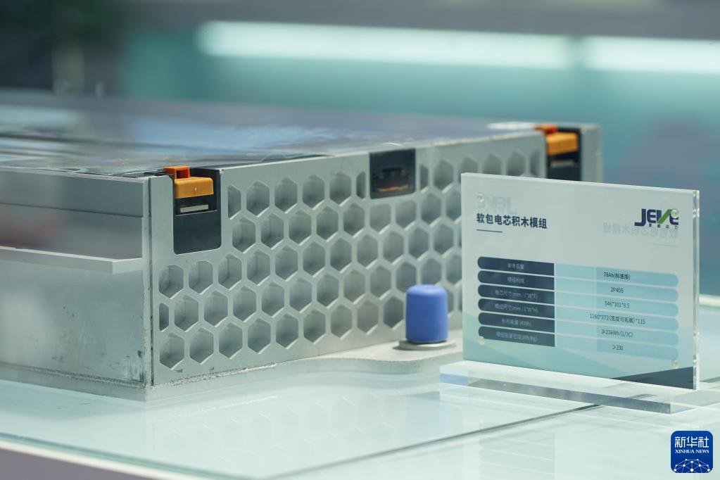 2022世界動力電池大會綠色低碳出行展覽會上展出的積木電池模型(7月21日攝)。