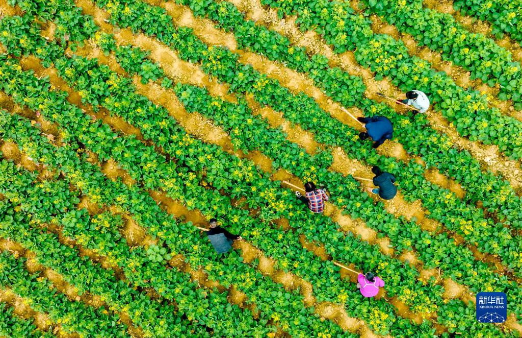 2月19日,村民在貴州省黔西市林泉鎮合心村的油菜地裏勞作(無人機照片)。
