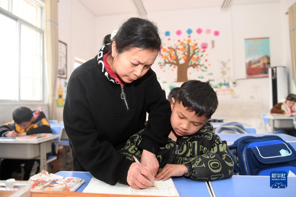 廣西金秀瑤族自治縣忠良鄉山界教學點的教師陶鳳英教學生寫字(3月15日攝)。