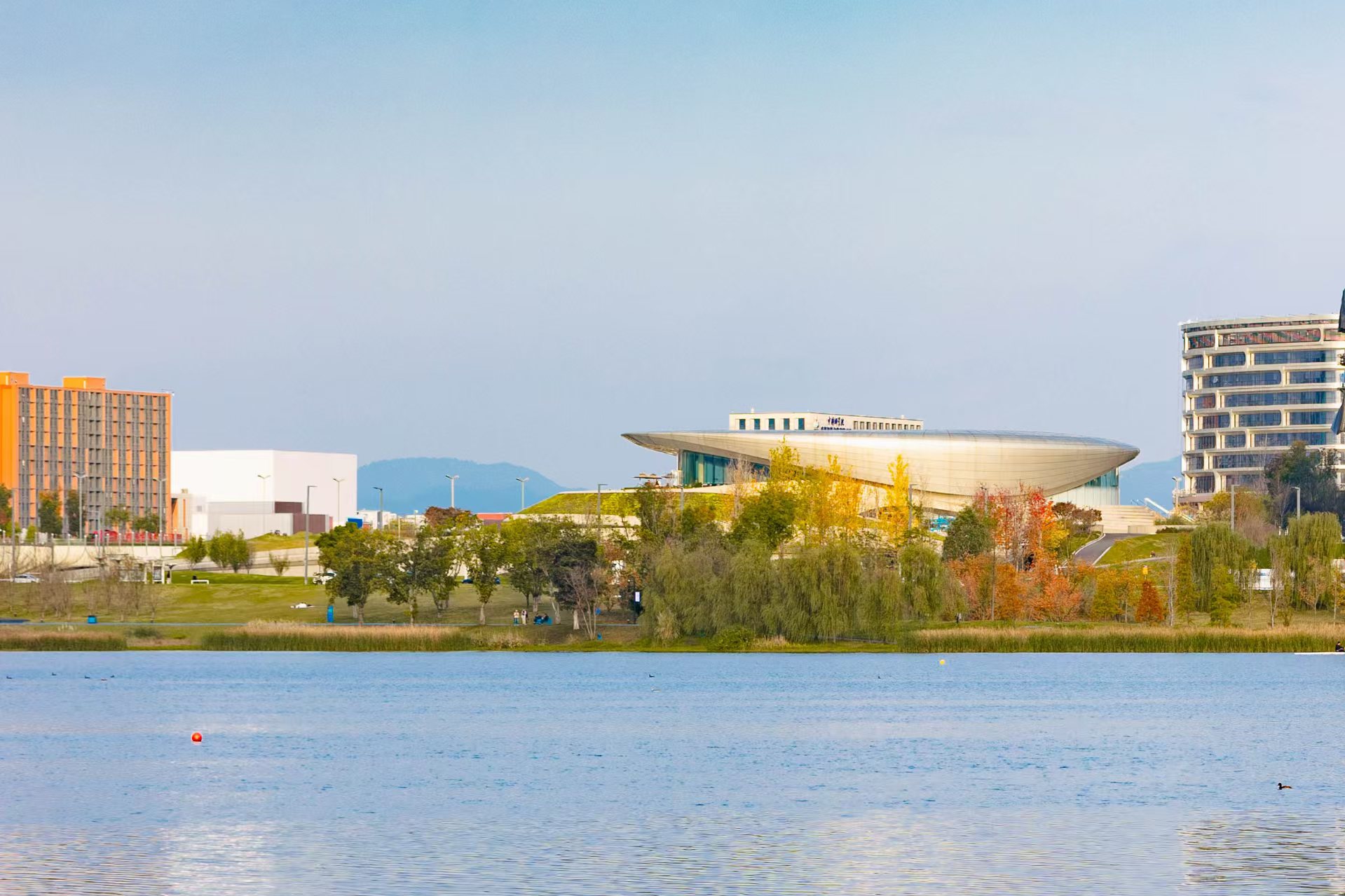 再看3號館,這裡打造的是創新和高效的多功能空間,整個館從地面一直延伸到湖面,宛如懸浮在湖畔上的一顆“鑽石”。據了解,3號館的局部架空形成開敞的獨立大空間,平臺層包含了成果發佈、對接、路演、體驗等功能空間,未來,這裡將舉行各類科技創新活動。