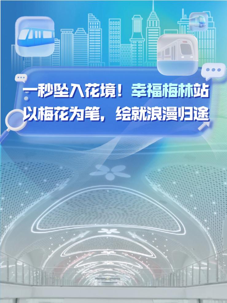 幸福梅林站文化主題定位是“遊夢梅庭”。車站設計以梅林花海為核心,提取梅花的花瓣進行不同的排列組合變化。進入車站,倣若瞬間置身梅林花海,天花板上朵朵梅花藝術燈爛漫可愛,漫反射燈光烘托出粉白交替的色調,帶來“梅林飄雪”的詩意氛圍。整體空間造型如同林木生長,形態優雅且流暢,在此處,不論四季如何變化,都能讓乘客一秒邂逅花動全城的浪漫與幸福。
