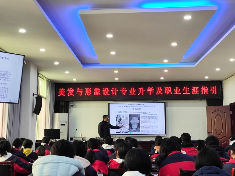 活動伊始,周宇主任一行在沙灣職中領導及專業教師陪同下,實地查看美發與形象設計專業學生的繪畫作業及實踐作品,直觀掌握學生學習成效與專業教學現狀。隨後,專家團隊與該專業師生齊聚會議室開展專題分享,四川國際標榜職業學院胡兵老師圍繞專業核心課程、技能考證標準、就業前景及對口高考要求作詳細解讀,內容兼具專業性與實用性;唐榮軍主任針對師生關切的升學規劃、職業發展等問題逐一答疑,切實為大家排憂解難。