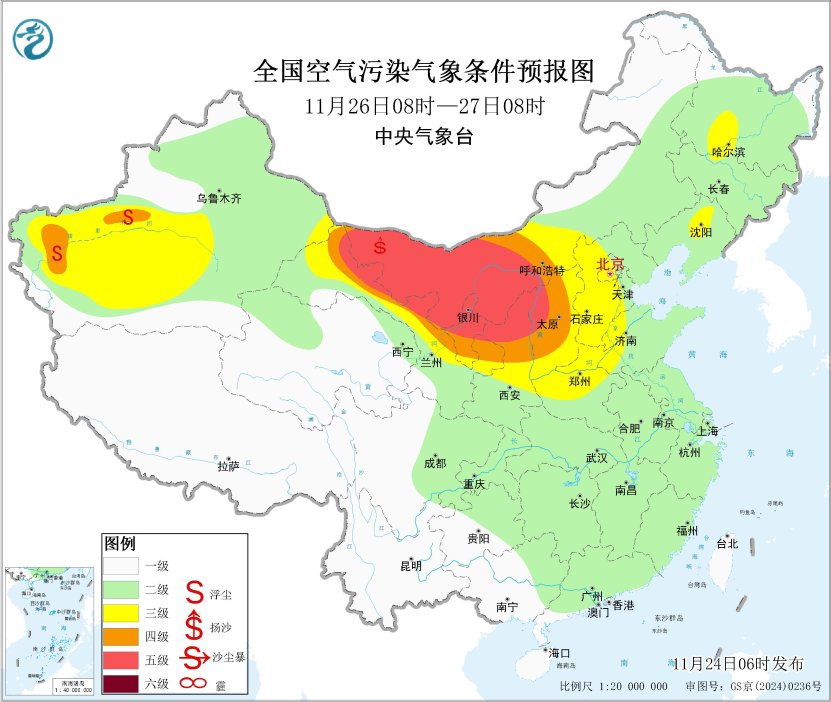 24日,陜西北部、山西等地的部分地區有揚沙或浮塵天氣。26日,受上游沙塵傳輸影響,區域部分地區將有揚沙或浮塵天氣。