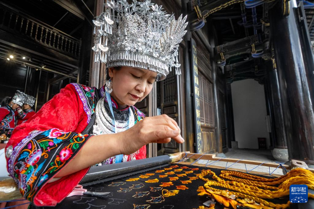 11月23日,重慶酉州苗繡市級傳承人陳國桃在2025非遺品牌推廣周上刺繡。新華社記者 胡超 攝