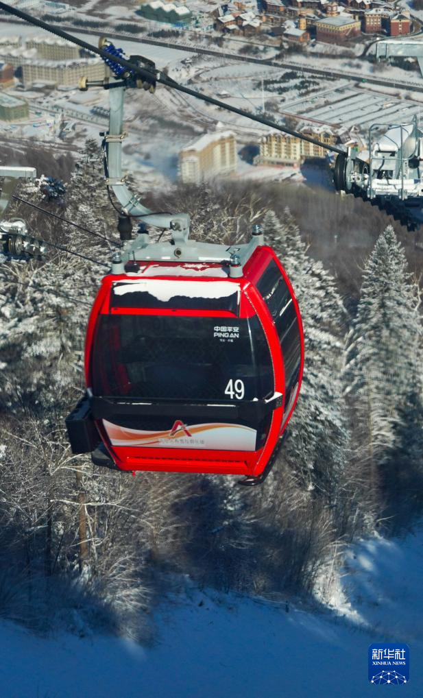 這是12月2日在吉林市北大湖滑雪度假區拍攝的由北京起重運輸機械設計研究院和徐州天馬索道纜車設備有限公司共同研發生産的纜車(無人機照片)。據介紹,北大湖滑雪度假區的纜車國産化達90%以上。新華社記者 顏麟蘊 攝