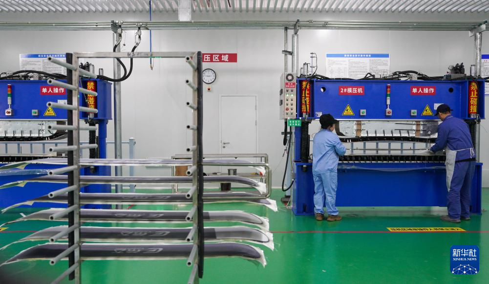 12月4日,在吉林化纖國興複合材料有限公司車間內,工作人員用模壓機製作碳纖維滑雪板。新華社記者 顏麟蘊 攝