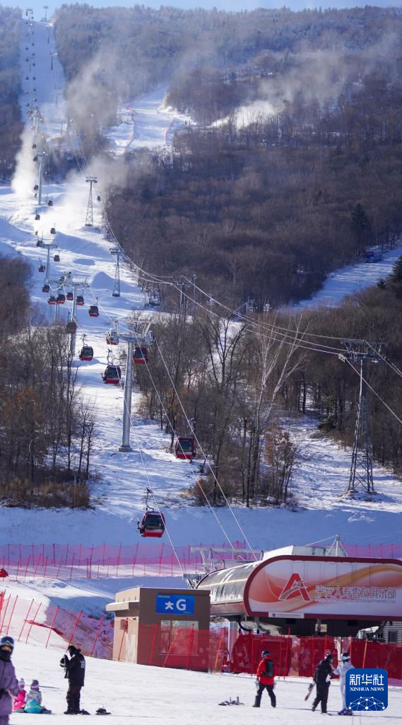 12月2日,在吉林市北大湖滑雪度假區,滑雪愛好者乘坐國産纜車達到山頂(無人機照片)。新華社記者 顏麟蘊 攝