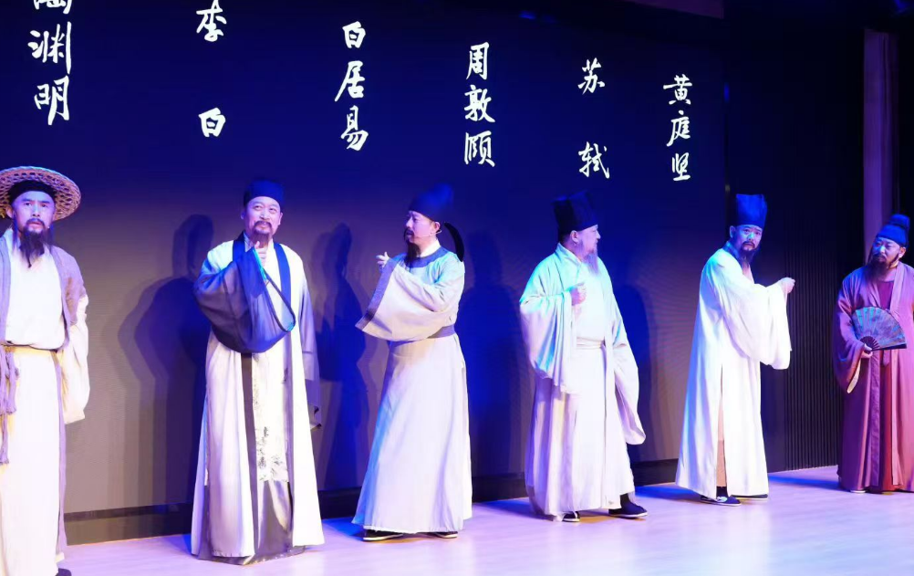 隨後,活動進入了情景劇部分,這部濃縮45分鐘的文化盛宴,以“四季”為軸,通過跨界藝術形式生動再現了課本中的九江記憶。演員們通過精湛的表演、優美的臺詞和富有巧思的舞臺設計,帶領觀眾穿越時空,身臨其境地走入詩詞的世界。或許是與李白同望“飛流直下三千尺”的廬山瀑布,感受其磅薄氣勢;或許是隨白居易漫步江畔,體味“春來江水綠如藍”的潯陽春色;又或是與陶淵明對話,追尋“採菊東籬下”的田園詩意……一幕幕極具九江地域文化特色的詩詞場景被立體呈現,課本中熟悉的詩句被賦予了全新的生命力和情感溫度。