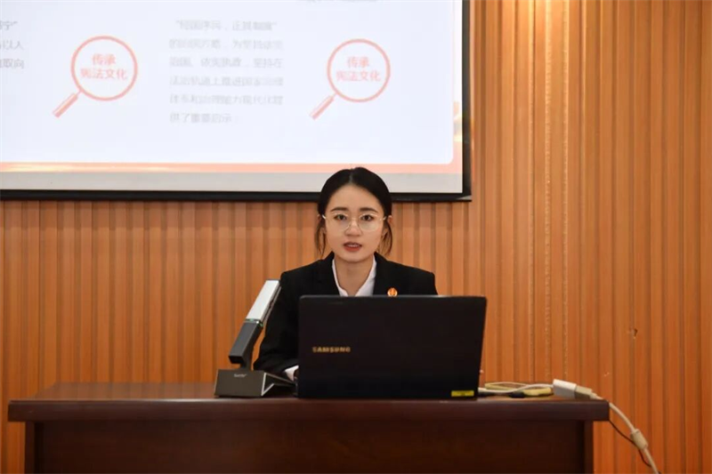 隨後,她圍繞傳承中華優秀傳統法律文化、創新新時代法治文化、推進全面依法治國、弘揚社會主義法治精神四個維度,緊密結合當代法治實踐成果、林區工作實際與生態保護典型司法案例展開論述,使抽象的憲法理論轉化為可感知、可踐行的行動指引,凝聚成守護綠水青山的堅實法治合力,真正讓“紙面上的法律”融入日常工作與生活。