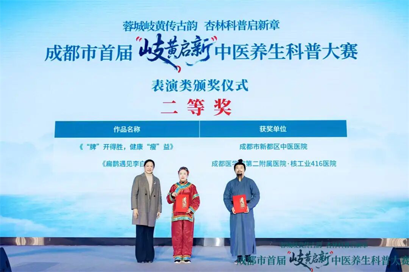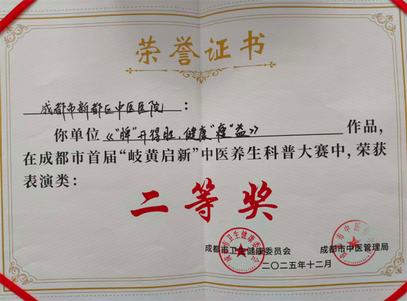 發佈時間:2025-12-05 15:52:07 | 來源:中國網 | 作者: | 責任編輯:孫玥12月3日,由成都市衛生健康委員會、成都市中醫管理局舉辦的成都市首屆“岐黃啟新”中醫養生科普大賽圓滿完成,新都區中醫醫院治未病科參賽項目《“脾”開得勝,健康“瘦”益》榮獲表演類二等獎。