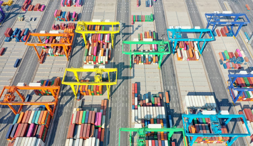 在天津港全物聯網集裝箱碼頭,場橋在堆場內吊運集裝箱(無人機照片,2月21日攝)。新華社記者趙子碩攝