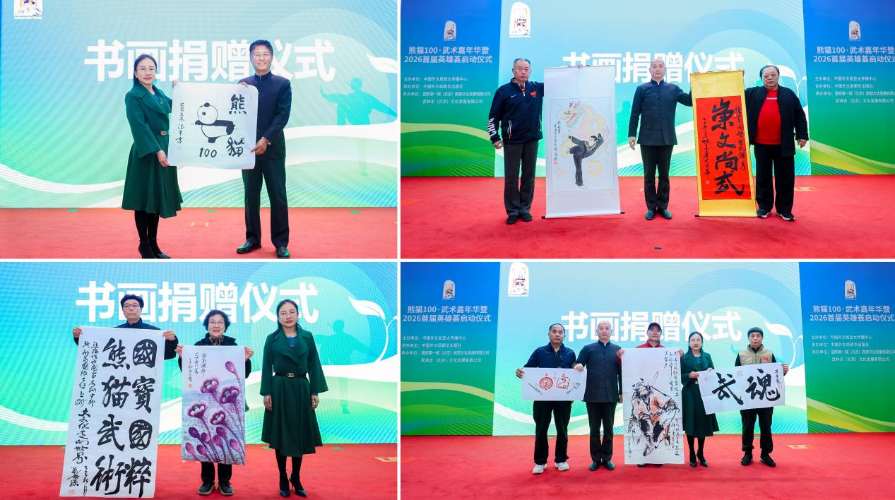 文化的力量,在武與文的交融中綻放。八位書畫名家現場捐贈作品,以筆墨表達對武術的支援。隨後,趙珺、張科、周亮等嘉賓共同按下啟動裝置,宣告“熊貓100•武術嘉年華暨2026首屆英雄薈”正式揚帆啟航。