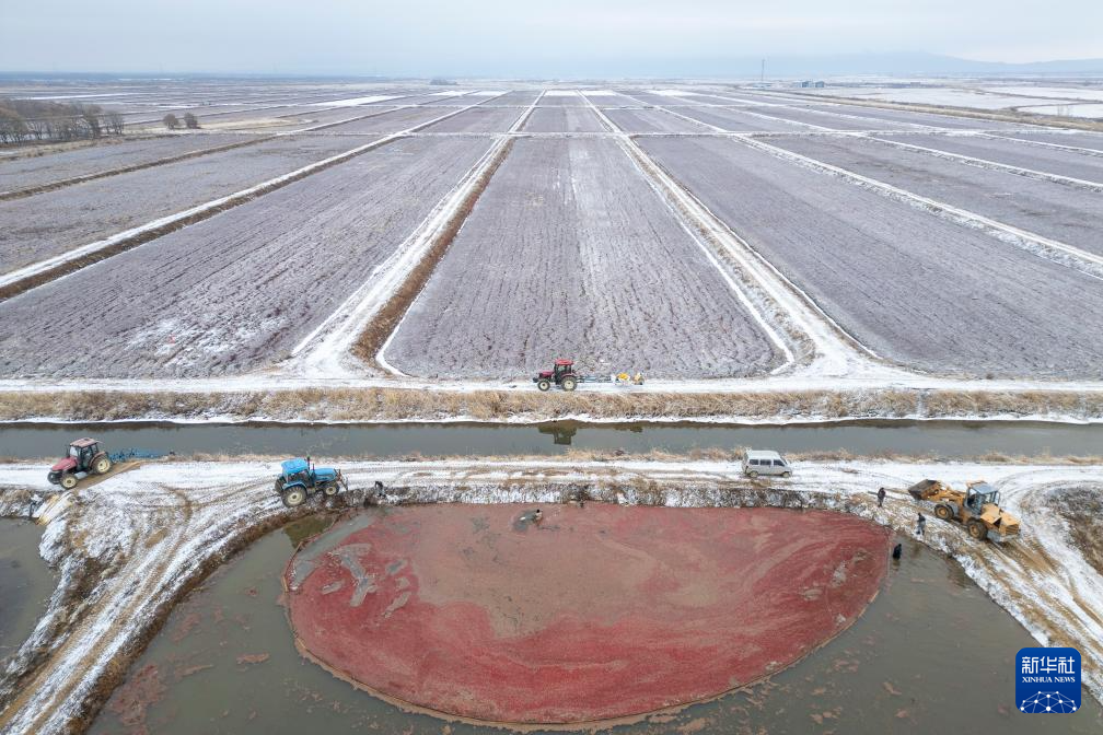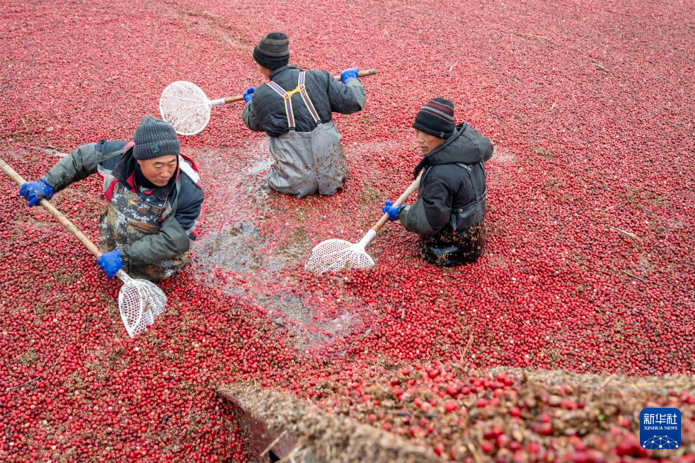 11月6日,在撫遠市蔓越莓種植基地,工作人員在水中采收蔓越莓。