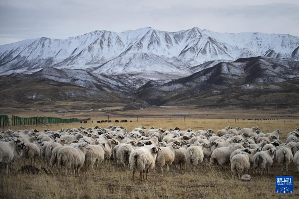 這是11月9日在青海省海北藏族自治州祁連縣仟戶牧場草場拍攝的無角藏羊羊群。