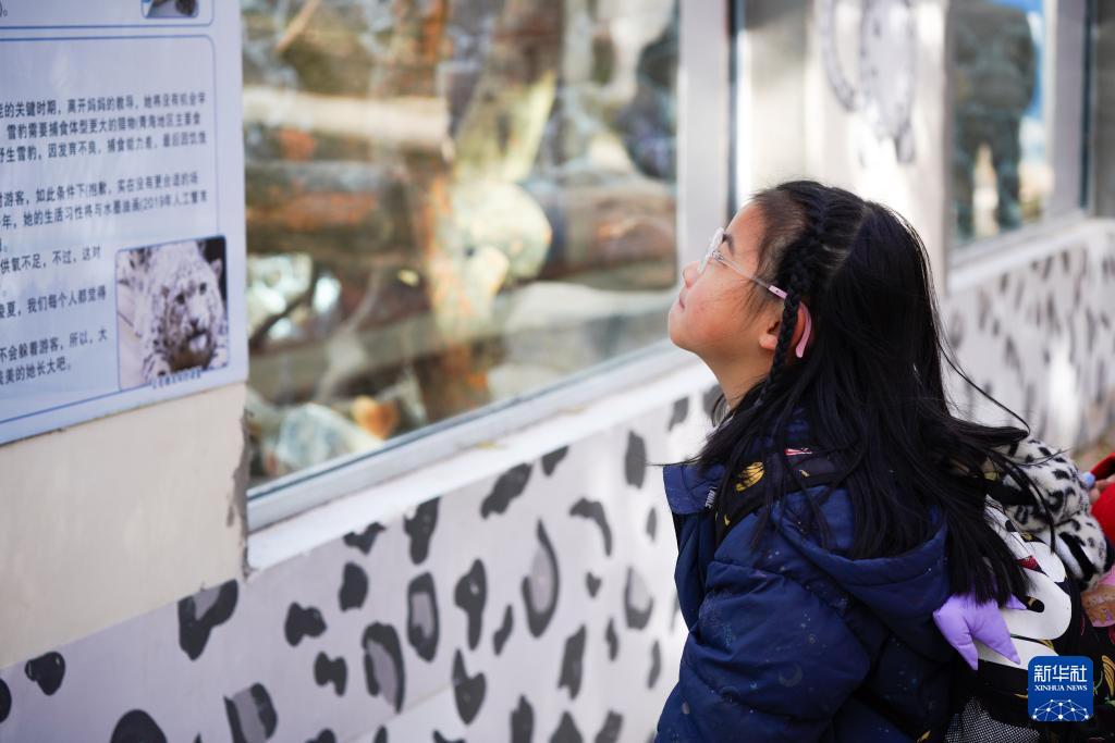 11月15日,在青海省西寧野生動物園,一名小朋友在閱讀雪豹的救助故事。