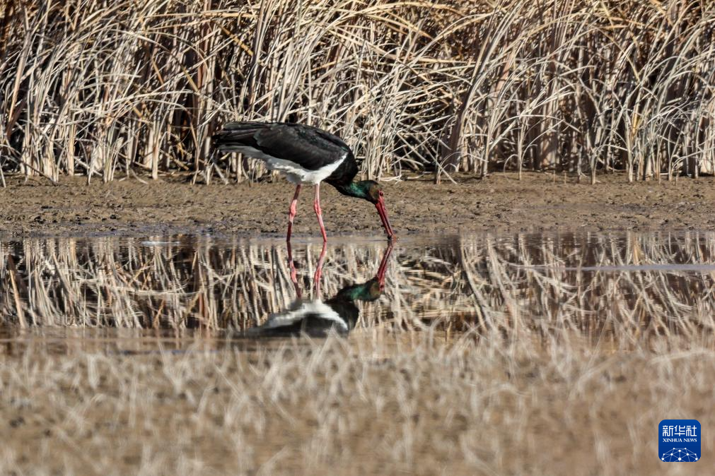 11月12日,黑鸛在張掖黑河濕地國家級自然保護區高臺段一處濕地淺灘覓食。