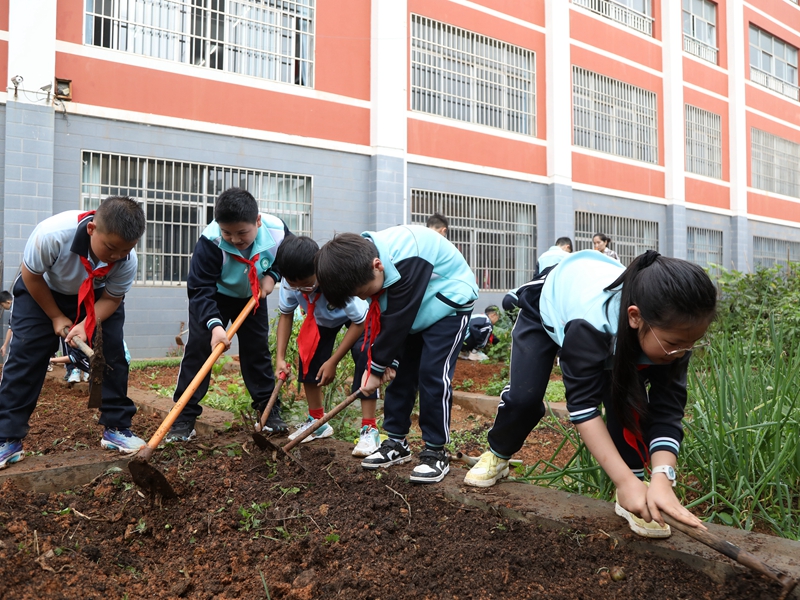 教室外,學校勞動教育實踐基地一派繁忙景象。同學們在老師的帶領下進行鋤草、翻土、播種等實踐活動,讓孩子們親身體驗勞動的辛苦與樂趣。