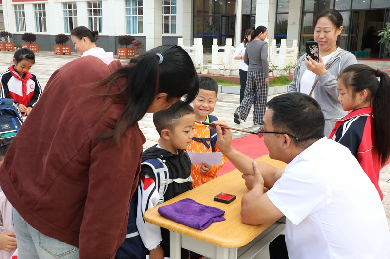 老師們整齊地站立在校門口,微笑著迎接每一位新生和家長。在簽到墻前,孩子們用稚嫩的筆跡認真寫下自己的姓名。繞過簽到墻,老師手持硃砂筆,輕輕地在每個孩子的額頭正中點上紅痣,意為開啟智慧,從此眼明心亮。