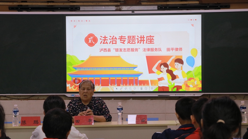 普法宣傳,為營造安全的校園環境注入新動力。瀘西縣銀發志願法律服務隊隊長田平帶領隊員深入全縣中小學、幼兒園開展法治講座,根據學生、教師、家長三類群體的實際,通過真實案例、播放警示教育片、法律知識講解等方式,有針對性地講解防校園欺淩、早婚早育危害、交通安全等法律法規和自我防範知識,講解《中華人民共和國家庭教育促進法》《中華人民共和國民法典》等法律法規累計50余場次。法治講座為營造安全的校園環境注入了新動力,既強化了三類群體的法治觀念,又增強了社會、家庭、學校聯動教育的力度。