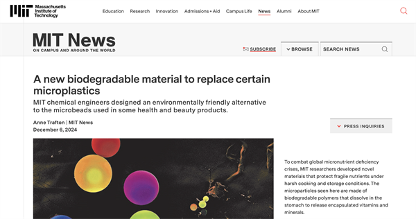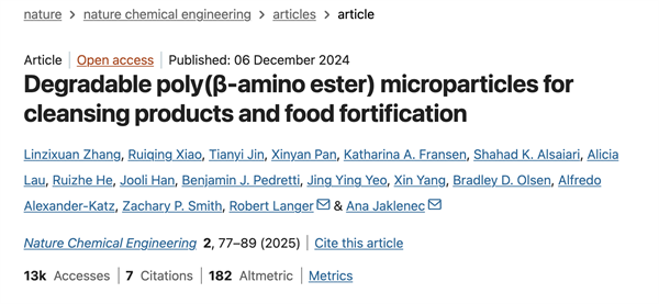 在MIT的五年博士生涯中,張林子鉉聚焦于一個核心問題:如何通過新型材料的研究與應用,將實驗室創新轉化為能夠真正服務社會的解決方案。她與團隊開發了一類可降解的聚合物微粒——聚(β-氨基酯)(PAE)。這類材料能實現對多種微量營養素(包括維生素A、維生素D、維生素E、維生素C、鋅和鐵)的穩定化與控釋,使其在烹飪和儲存中保持活性,並能在人體內可控釋放,從而提升吸收效果。該技術為應對“隱性饑餓”(hidden hunger)——即熱量攝入充足但缺乏必需微量營養素所造成的營養不良問題提供了新的可能。相關研究發表于國際頂級期刊《Nature Chemical Engineering》。