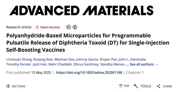 此外,她參與了另一項面向公共健康挑戰的研究:開發一種“自助加強”型疫苗平臺,利用聚酸酐材料(polyanhydrides)構建可編程脈衝釋放微粒,並借助人工智慧技術篩選材料組合。通過單次注射即可實現多劑次疫苗的效果。這一成果發表于《Advanced Materials》。