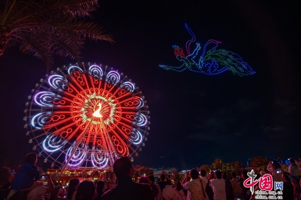 國慶期間,每晚的無人機煙花秀成為滇池畔最璀璨的風景。千架無人機與高空煙花聯袂呈現,通過動態編隊技術在夜空中勾勒出“祝福祖國”“鄭和故里”“特色雲南”等主題圖案。璀璨的燈光與絢麗的煙花交織,在滇池上空構築一場“硬核浪漫”的視聽盛宴。這場科技與藝術的完美結合,不僅展現了現代科技的無限可能,更以震撼的視覺語言傳遞了對祖國的深情祝福,成為遊客爭相打卡的亮點。