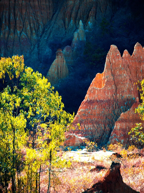 色彩斑斕是浪巴鋪土林的又一獨特魅力。頂部以紫紅色為主,宛如被夕陽染上了絢麗的色彩;中上部為灰色,給人一種沉穩而神秘的感覺;中下部則以黃色為基調,其間還夾雜著褐紅、灰白、棕黃、灰黑、櫻紅等多種色彩,仿佛是大自然這位藝術大師精心繪製的畫卷。在陽光的照耀下,這些色彩相互交織、變幻,使整個土林呈現出如夢如幻的景象。