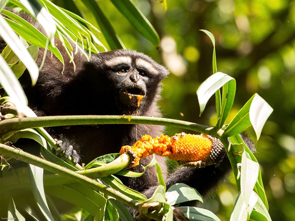 (高黎貢白眉長臂猿取食過江龍果實。譚祥芳/攝)