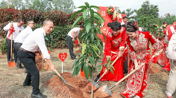 隨後的“植”子之手,共植“囍樹”環節則將浪漫誓言昇華為紮根大地的長久承諾,新人們執起鐵鍬,培土澆水,共同挂上許願牌,精心種下了一片屬於他們的“同心林”。